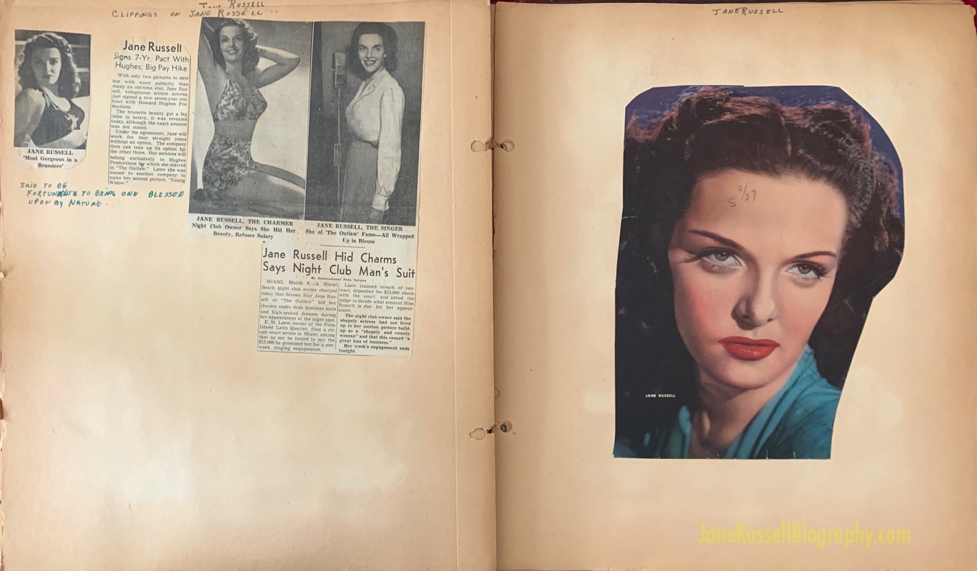 Here’s a fun piece of ephemera I picked up on the Jane journey – a homemade scrapbook dedicated to The Outlaw. Many of the clippings date from the 1946 release and the emphasis is totally on Jane, though that could be out of preference or sheer volume of publicity. I love that the book ends with a page devoted to the ticket stub from a screening. Mission accomplished!