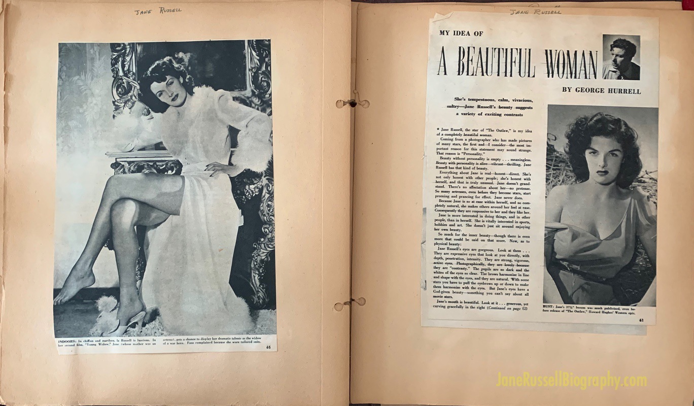 Here’s a fun piece of ephemera I picked up on the Jane journey – a homemade scrapbook dedicated to The Outlaw. Many of the clippings date from the 1946 release and the emphasis is totally on Jane, though that could be out of preference or sheer volume of publicity. I love that the book ends with a page devoted to the ticket stub from a screening. Mission accomplished!
